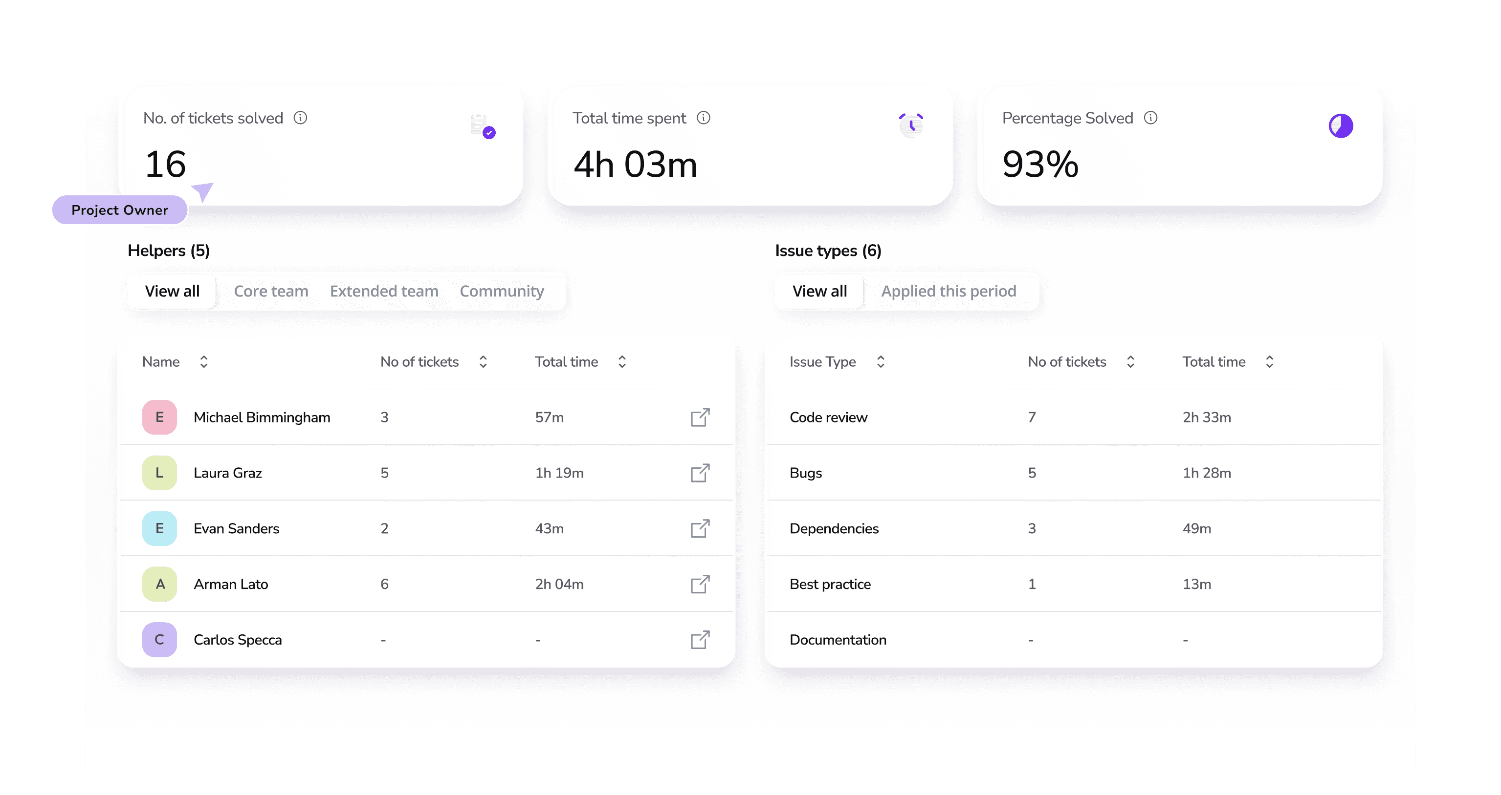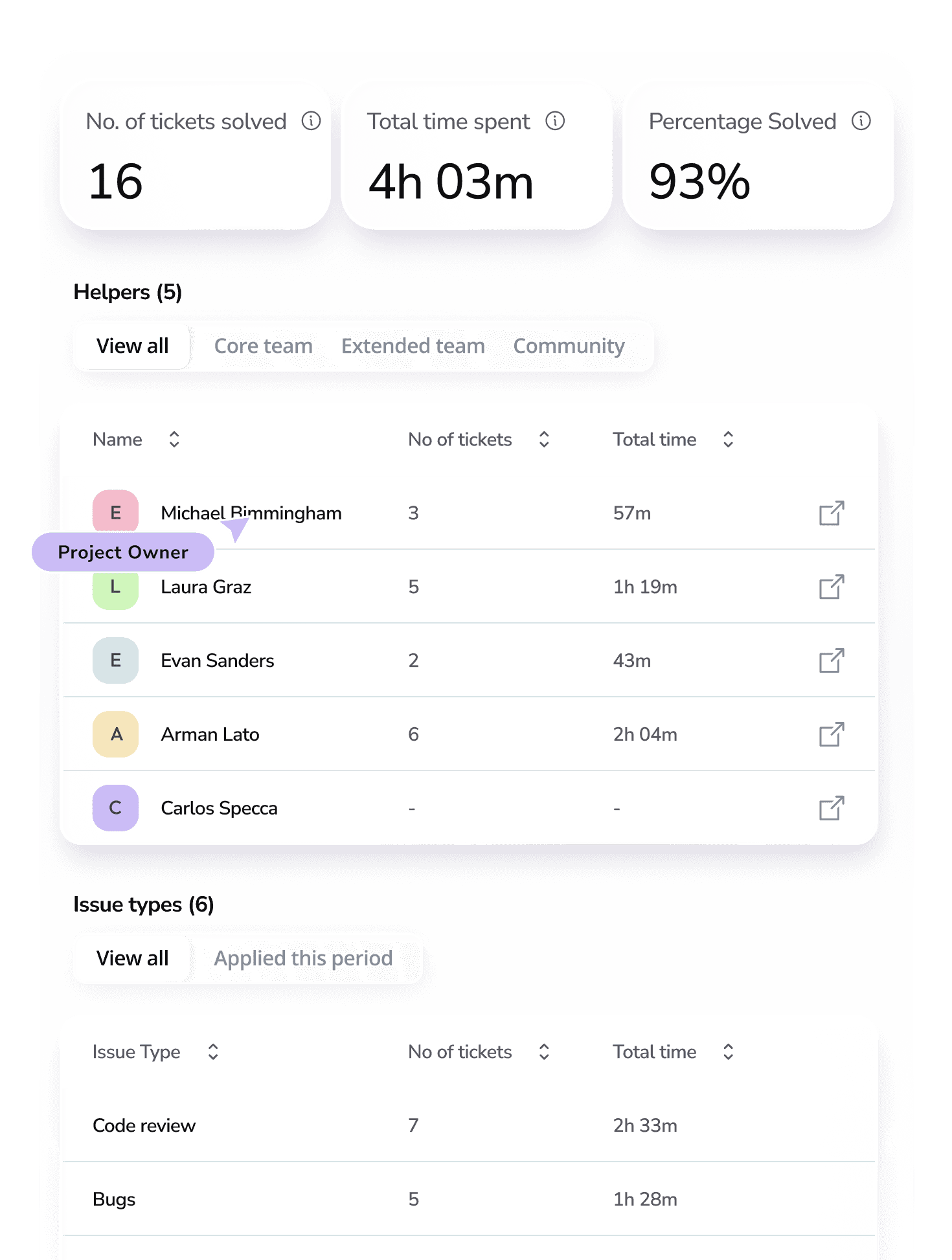 See how your team and community are performing in solving tickets. Easily remove helpers that don’t live up to your standards, or follow them up directly to improve their performance.