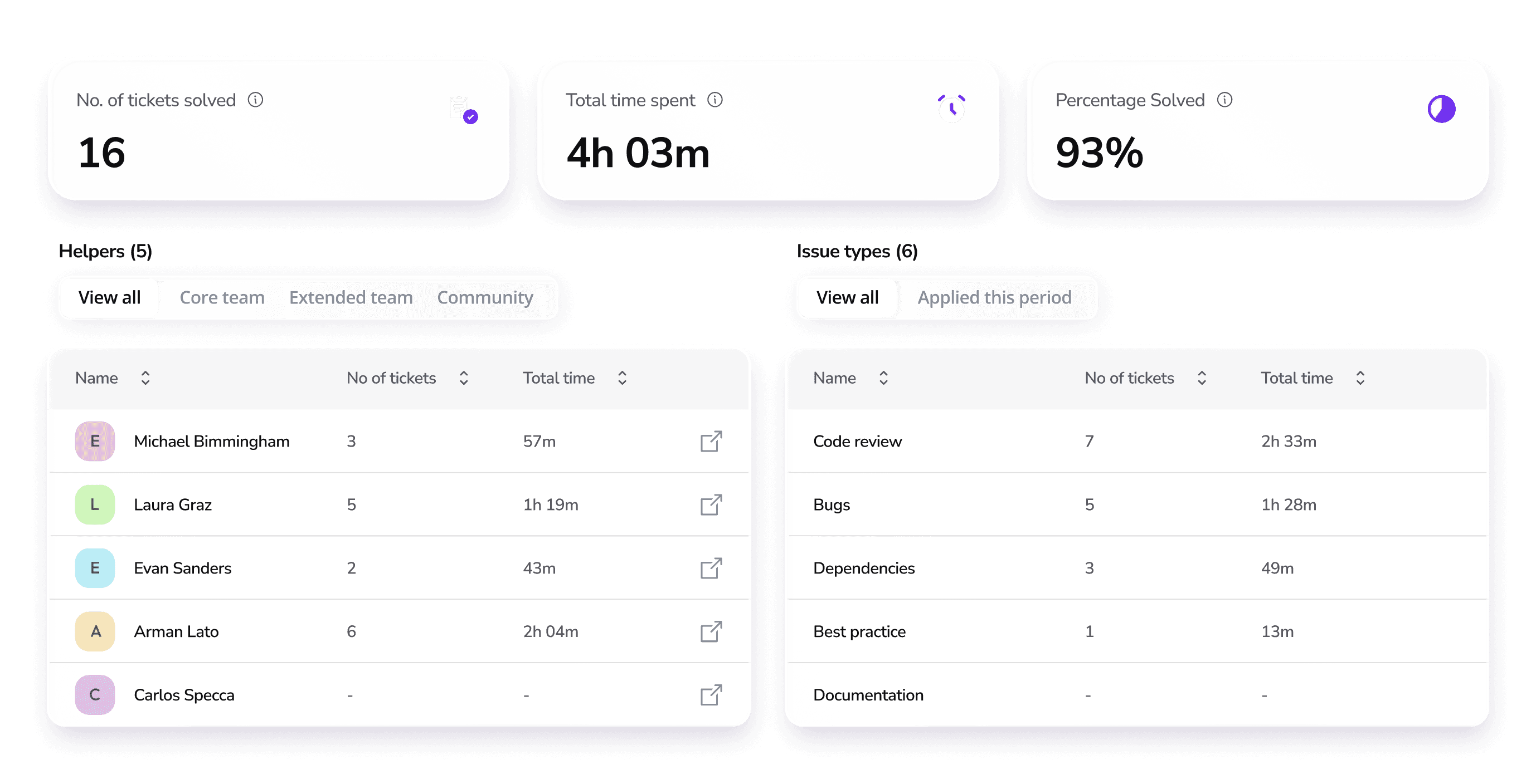 A full real time overview of data related to your tickets. Including time spent, involved helpers, percentage solved and issue types.